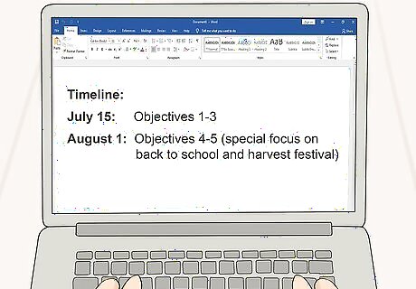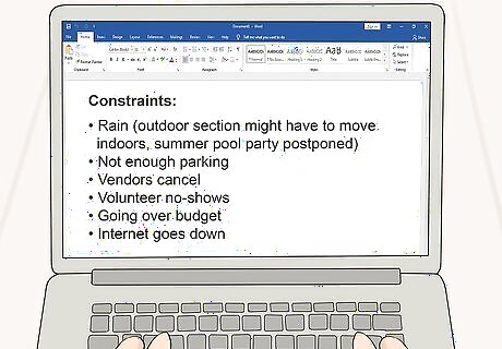 Name any potential risks that could impact the project. All projects involve certain risks that stakeholders should be aware of. These can range from scheduling delays to permit problems that could endanger the whole project. While researching the budget and schedule, identify all the risks this project could face. If possible, present suggestions that could overcome these setbacks. For example, if you’re planning a building project, one potential risk is the price of raw materials going up and impacting the project budget. You might propose that working fast is the best option for avoiding this risk. Alternatively, you could propose buying certain materials ahead of time and storing them so the project doesn’t encounter unexpected price increases.