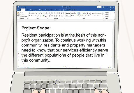 Define the project’s scope to plan how you will complete it. The scope is the intended result of the project. What will this project accomplish when it’s completed? What objectives will it meet? Having a clear idea of the project’s scope is crucial for planning what steps you’ll take to meet those goals. In speaking with the important stakeholders, get an understanding for what the intended project scope is. For instance, a project scope could be building a new luxury apartment building. All the subsequent planning will build towards this end result. Make sure the project scope is feasible. For example, if a sponsor wants to travel to Mars next year, this is probably not a manageable scope. Talk with the sponsor and inform them of what is currently possible, and then work out a scope you can meet. If the sponsor is not entirely sure what the intended scope for the project is, help them work it out. Speak with them and the project managers to come to a conclusion on what the end result should produce.