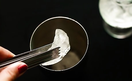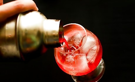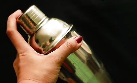 Leave the strainer to the shaker on as you take off the lid. Pour the shaker's contents into the Sprite glass while straining it.