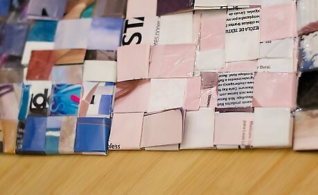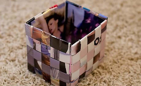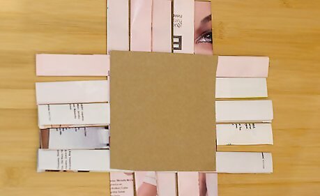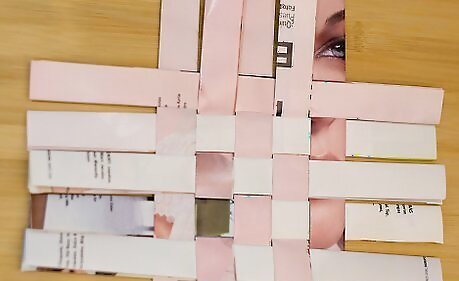Weave six strips vertically through the horizontal piece you made in the previous step. As you weave, switch from under, over, under, over, to over, under, over, under, for every strip of magazine.