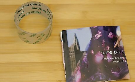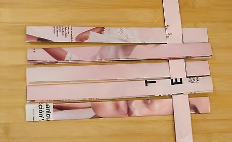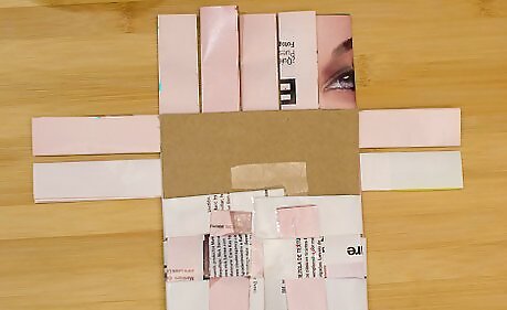 Cut a magazine piece to the size of the cardboard piece. Tape it on the back to cover up the taped edges and the cardboard itself. It's recommended that you add clear tape to this side too, just to strengthen it and to prevent it from being torn when objects are slipped inside the bag.