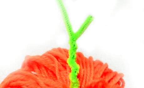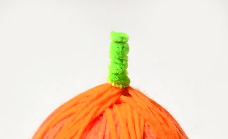 Tie a 2-inch (5.08-centier) piece of green or brown pipe cleaner to the center of your pumpkin. Cut a green or brown pipe cleaner down to 2 inches (5.08 centimeters) and place it on top of your knotted yarn. Tie the ends of the yarn over the pipe cleaner in another double knot.