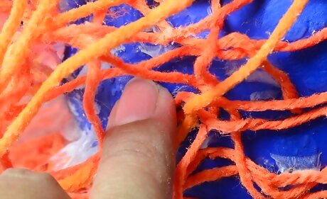 Continue dipping the yarn into the glue and wrapping it around the balloon. You don't always have to start at the tail end of the balloon. You can even wrap the yarn around its equator for a different effect. Remember to press down on each end of the yarn to seal it. The yarn won't completely cover the balloon. You will get something that looks like a basket or filigree.