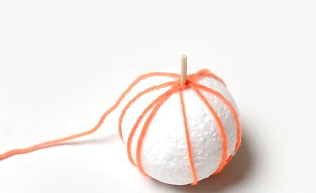 Start wrapping the yarn around your pumpkin, gluing as you wrap. Make sure that each round of yarn is touching so that no pumpkin (or Styrofoam) is showing. Also, be sure to place some glue into the grooves of the pumpkin to enhance their rippled shape. There are lots of different ways you can wrap your pumpkin: Wrap the pumpkin vertically, from base to stem. Use a separate piece of yarn for each wrap. Wrap the pumpkin horizontally in a spiral from bottom to top, using one, long piece of yarn. Wrap the yarn in triangular-shape spirals around the pumpkin.