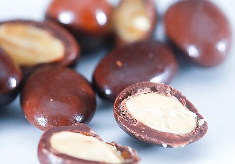 Use almonds for candy. Almonds have a wonderful shape that is just perfect for turning into candies, and the flavor is liked by many. Here are some suggestions: Make candied almonds Make sugar or Jordan almonds – these are often used for wedding favors; they can be made plain white or can be colored to suit a theme Make almond bark Chocolate coated almonds.