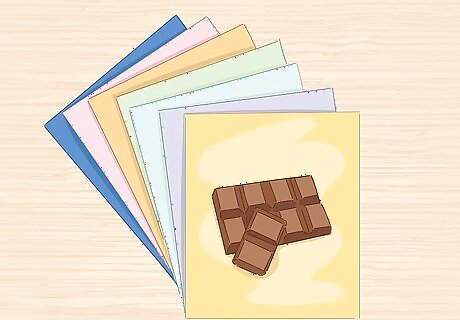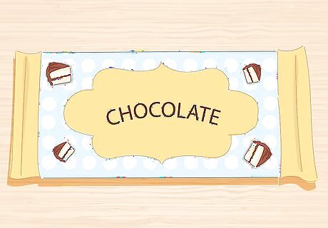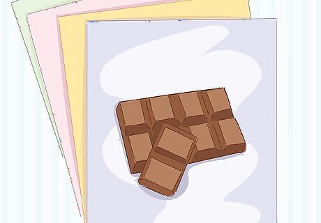 Wrap the chocolate in colored foil paper, if desired. Colored foil paper is different from aluminum foil; you can find it in the baking section of a craft store. Set the foil down with the back (paper side) facing you. Place the chocolate face-down on top. Fold the sides of the foil over onto the back of the chocolate, then fold the top and bottom edges down as well. Secure the foil with a strip of tape, if needed. If your chocolate came wrapped in foil leave the original foil on and wrap the new foil around it. It's more hygienic this way. If your chocolate came wrapped in plastic, fold the sealed ends to the back and tape them down first. Wrap the foil paper around the chocolate. Colored foil paper has foil on the front and paper on the back. You can find it online or in the baking section of a craft store. Choose a neutral color, such as silver. Alternatively, match the color to the wrapper: pink, blue, yellow, or purple.