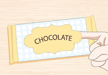 Add a homemade label to the front of the candy bar. Purchase pre-made labels online or design and print them yourself using a word editing program (i.e. Microsoft Word). Stick the label onto the front of the chocolate bar. If you can't get pre-cut, self-adhesive labels, print them out on regular paper. Cut them out, then secure them to the chocolate bar with double-sides tape. If you have nice handwriting, you can write on the words on the labels yourself. If you don't want to use labels at all, use letter stickers to write a name or word on the chocolate.