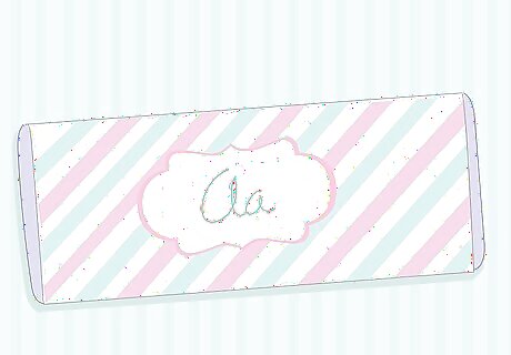 Decorate the chocolate bar further with themed stickers, if desired. Choose some stickers that match the theme of the wrapper, then add them to the left or right side of the label. If you have a tiny sticker and a huge candy bar with a big label, you could add the sticker to the corner of the label instead. Stickers shaped like baby rattles and bottles make great choices, but you can use other ones too. You can find lots of stickers in the sticker and scrapbooking section of a craft store. They are often organized by theme.