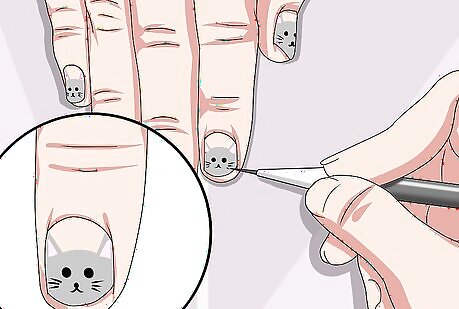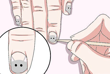 Use your dotting tool to create eyes. You can purchase a dotting tool at your local beauty supply store. If you are interested in nail design, this is a worthwhile investment. If you do not want to purchase a new tool, you can use the rounded tip of a bobby pin or any other small, round tip. Dip your dotting tool into black polish. Press them down onto the cat's face to create two black eyes. Then, use the dotting tool again to create the whites of the eyes. Use less pressure, so that the polish doesn't fill in the entirety of the black dot you've already created. After this step, the eyes should look like white dots with thin black rims around them. Finally, dip your dotting tool into the black polish again and create very tiny black dots in the center of the white dots. These are the pupils. Use a very light hand in order to make them very small.