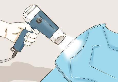 Heat the craft foam armor over a heat gun or with an iron. To shape the armor so that it fits your body, you’ll first need to heat it up with a heat gun, a flameless gas stove, or an iron. Hold your foam over the heat for just a few seconds. You can wear oven mitts to protect your hands, but you shouldn’t heat the foam long enough for it to be painful to hold. The easiest way to heat your foam is with a heat gun, which you can find in the stamp section of crafting stores, but you can also use other options, like a gas stove or an iron over an ironing board. Don’t use a lit stove with a flame, which could cause the foam to catch fire.Tip: Practice heating your foam with a few scratch pieces first. See how long you need to heat it for it to get pliant and floppy, but not bubbly or melted.