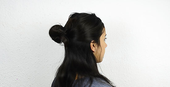 Pull back only the top section of your hair for a half-up half-down look. Wearing your hair half-up is a great way to change up your style while keeping your hair out of your face. Use the end of a rat-tail comb to part your hair horizontally from ear to ear, then gather the top half of your hair and secure it with an elastic. This style works on almost any hair length, and it can be worn on straight, wavy, or curly hair. Braid small sections of your hair to add more interest to this look. You could braid a few pieces in the top half of your hair before you pull it up, or braid a section behind your ear and leave it down. Add a small barrette just above your hair elastic for an extra feminine touch. You don't have to do the bun either, a half-ponytail is also fine.