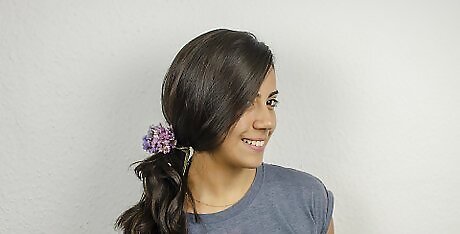 Tuck a flower or bow into an updo for a feminine look. Side buns and low or side ponytails in particular look pretty and romantic when you add a flower or a bow to the style. Create the style you want, then nestle the accessory into your hair close to the elastic. If you need to, secure the flower or bow with bobby pins.