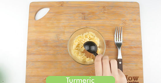 Blend in the baking soda and turmeric. When the banana is mashed, add ½ teaspoon (2 g) of baking soda and ½ teaspoon (1 ½ g) of turmeric powder to the bowl. Blend until all of the ingredients are well mixed. Baking soda helps absorb excess oil from the skin so it won't clog your pores and cause breakouts. Turmeric has antibacterial properties that help fight acne.