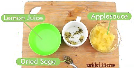 Mix the applesauce, lemon juice, and sage. Add 1 tablespoon (16 g) of applesauce, 1 teaspoon (5 ml) of fresh lemon juice, and 1 teaspoon (1 g) of dried sage to a small bowl. Mix the ingredients together until they're well blended. Both apples and lemons contain natural fruit acids that help remove excess oil and exfoliate the skin. Sage is an herb that helps tighten the pores. You can substitute dried peppermint or lavender, which also have astringent properties.