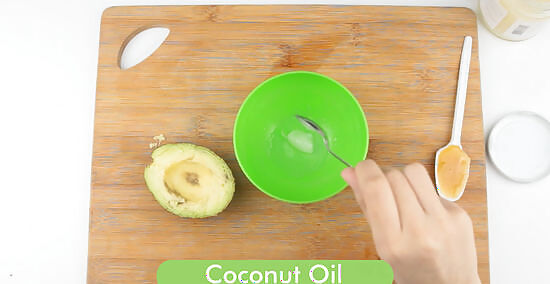 Stir in the coconut oil and honey. Once the avocado is mashed, add ½ teaspoon (2 ¼ g) of coconut oil and 2 tablespoons (43 g) of honey to the bowl. Mix well until all of the ingredients are blended together. Like avocado, coconut oil contains healthy fats that effectively hydrate the skin. Honey is extremely soothing for dry, irritated skin.