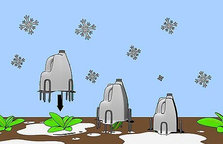 You can push loop stakes in the holes to hold the milk jug hot caps down over plants. Each milk jug hot cap will have 4 loop stakes, one for each tab. You can buy several packages of loop stakes at a hardware store like Lowe's or a garden store for a package of 10. You can also make your own loop stakes from used hanger wire. You will need a lot of hangers; ask your local charity store or dry cleaner for spares.
