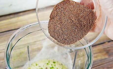Add ingredients into a blender. Add hemp protein, flaxmeal, toasted carob, raw cacao, vanilla bean powder, stevia, chlorella, and maca powder into a blender or food processor.