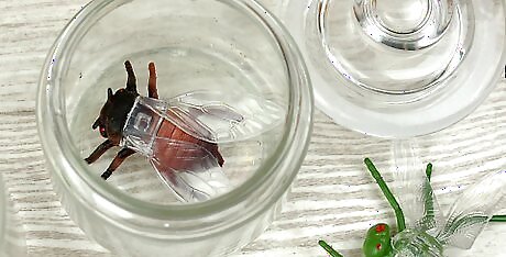 Drop Halloween-themed objects into each jar. Get creative and look for creepy objects that would look good in jars. Toy bugs, eyeballs, doll parts, skulls, or any other scary things you come across would be great. Then drop a few into each jar. Some objects may float in water. If they do, weigh them down by taping a coin to the bottom. Alternatively, put many of them in the jar so they force themselves down. If you don't have any suitable Halloween objects, then you can skip this step. Colored water alone will also look creepy!