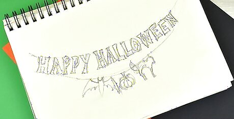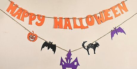 Pick a phrase or object for your garland. The Halloween garland can come in a variety of styles. Festive phrases like “Happy Halloween” or “Trick or Treat” are good choices. You can also make objects like pumpkins or bats. Decide which direction you’d like to take for your garland. Remember, you can make different streams of garland. Mix it up for a festive atmosphere. Make one streamer with pumpkins, one with black cats, and another saying “Happy Halloween.”
