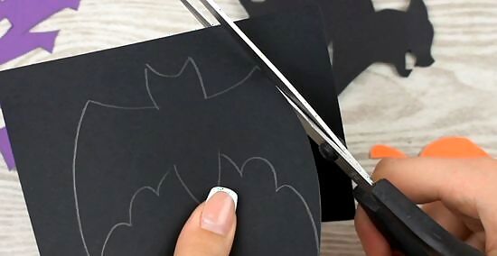 Cut out the shapes or objects you want to use on your garland. If you prefer objects like bats instead of phrases on the garland, then follow the same process. Take a piece of construction paper and trace out the shape you want to hang on your garland in pencil. Then cut around the lines to make the shape you want. Repeat this as many times as you have to and get the right amount of shapes. If you’re cutting bats, for example, draw out a bat shape on a piece of black construction paper. Then cut along the line to make your bat. Repeat the process and cut out as many bats as you need. You can also mix it up with different streams using phrases and objects. Make as many as you want to. If you don't want to draw out the shapes, then print them out on colored paper and cut along the lines. You can also use these printouts as a template to trace so your shapes are all uniform. Shapes can also mix into phrases. Placing a pumpkin between each letter of "Trick or Treat" on the same garland stream mixes up your decorations.