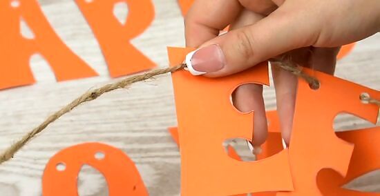 Run a string through each hole. Connect all the pieces together by tucking the string through each hole you punched. If possible, try to find a string color that matches the theme. Black string for jack-o-lanterns, for example, would look better than white string. Don't mix up the order of the letters if you're spelling out a word. Make sure that each word is spelled correctly.