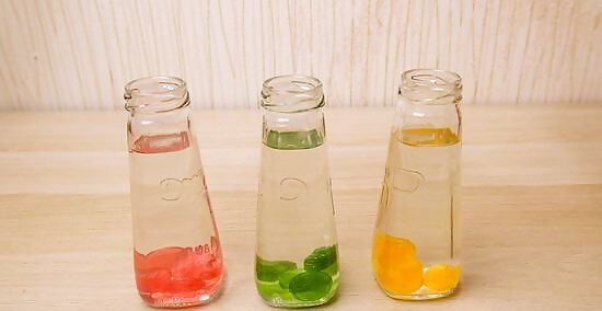 Add the candy in the flasks. Designate one flask to each flavor, unwrap the candies, and drop them in the bottles.