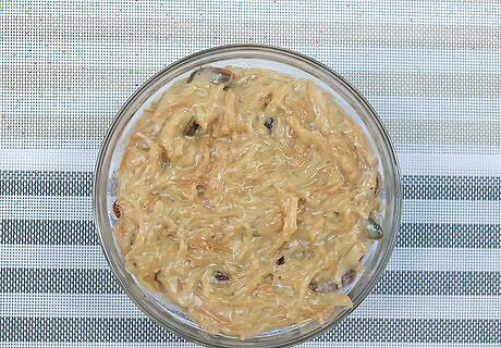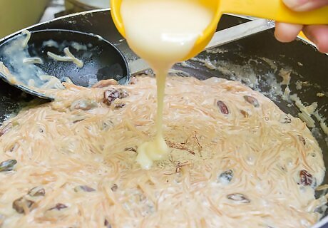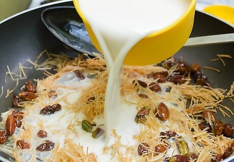 Cook your vermicelli kheer. Once you’ve roasted the vermicelli and dried fruits and nuts, you’re ready to cook the vermicelli kheer. Make sure to not leave the pan at this stage so that it doesn’t burn. To the roasted vermicelli in the pan, add the milk and a few of the nuts. Put a lid on the top of the pan for about 6-8 minutes to cook the vermicelli.