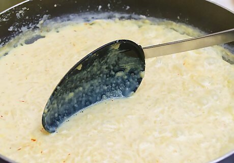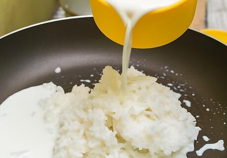 Cook your kheer. Once you’ve preheated the pan and done the prep work, you’re ready to cook your kheer. Make sure to not leave the pan at this stage so that your kheer doesn’t burn. Add the cup of slightly overcooked rice and 2 cups of whole milk to your heated pan. Lightly stir this mixture. If you like a smoother texture, mash the rice slightly before adding it to the milk. Add your mixture of saffron and sugar to the milk and rice in the pan.