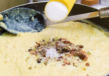 Add the sugar and remaining ingredients. Once your kheer has reached the desired consistency, add the 3 tablespoons sugar and the raisins and mixed nuts. Fold these ingredients into the mixture. Add the sugar before the raisins and mixed nuts. You might want to taste the kheer at this point to see if it needs more sugar. Drain the raisins and add them to the mixture along with the 1 tablespoon chopped pistachios and 1 tablespoon chopped almonds. Remove the pan from the heat and add the 1/8 teaspoon powdered cardamom.