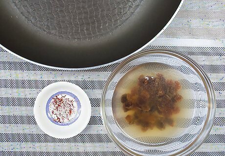 Prepare the pan and your ingredients. Before you start cooking kheer, heat the pan and prepare the saffron and raisins so that they’re ready to use as you cook. It’s important to do this before you begin cooking so that your kheer doesn’t burn while you mix the ingredients. Put the raisins in a little bit of water to puff them up. Use any small or medium heavy bottomed pan that you have to cook the kheer. Heat the pan over a medium gas flame or electric stove setting. While the pan is heating up, grind the saffron and a pinch of sugar with a mortar and pestle. Set it to the side.