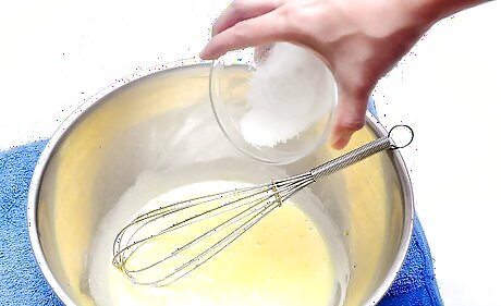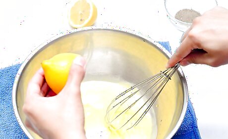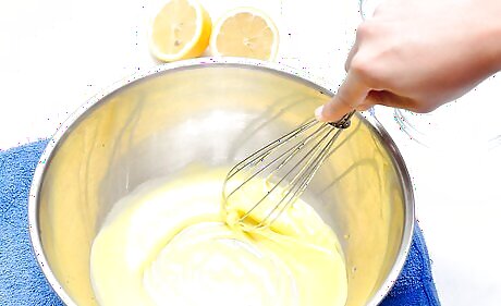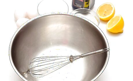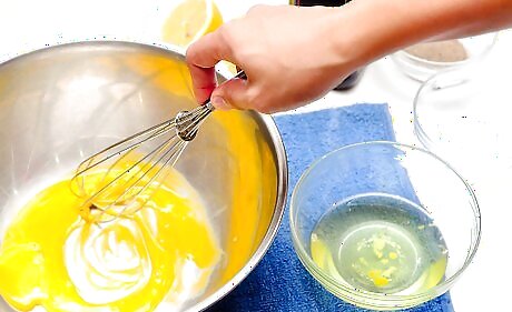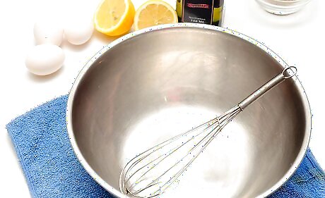 Lay a wet towel on the counter or table top you will be working on. This will keep the bowl from moving while you whisk. If you are going to use an electric mixer or blender, place it on a flat surface.