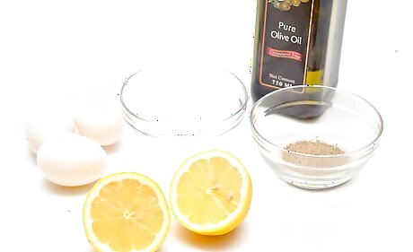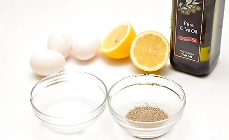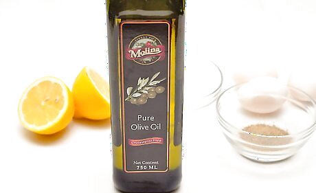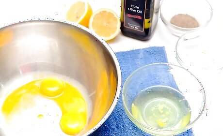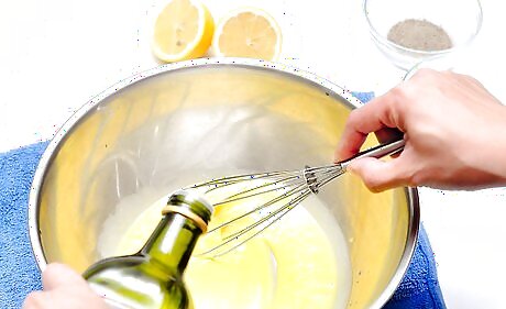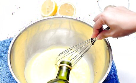 Add olive oil to the eggs one drop at a time. It is important to go slowly, or the oil will separate and not combine with the yolks. Incorporate each drop of olive oil completely before you add another drop. If you are using a blender or a mixer, keep it running through the whole process.