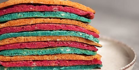 Make rainbow pancakes. Looking for a colorful twist to your pancakes? Rainbow pancakes are the way to go! They are quick, easy, and fun to make. Little ones enjoy the beautiful colors added to their pancakes for a lovely 'rainbow'.