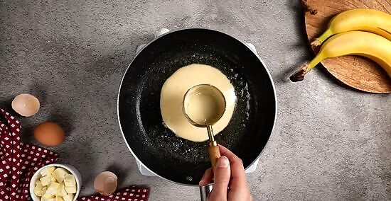 Pour about 3 tablespoons to 1/4 cup batter from the tip of a large spoon or from a pitcher onto the hot griddle or greased frying pan. The amount you pour will decide the final size of your pancakes. It is best to begin with less batter, and then slowly pour more batter onto the pan to increase the pancake size.