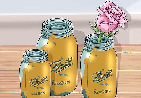 Turn old Mason jars into gilded vases. For this project, you’ll need several mason jars (size doesn’t matter), a foam brush, adhesive, and sheets of gold leaf. Apply adhesive to each of the jars in small, random patches. Wait 30 minutes for the adhesive to turn clear. Press the sheets of gold leaf onto the jars. Rub away any excess leafing with a paper towel. All of the materials for this project can be purchased at a craft store.
