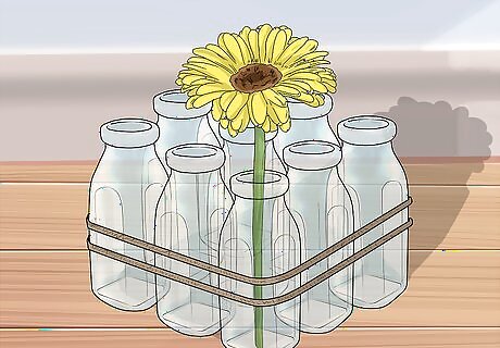 Make vintage vases. For this project, you will need nine vintage milk bottles and gardener’s twine. Line up the nine bottles in three rows of three. Wrap the twine around the bottles twice to attach them to each other. Tie the ends of twine together in a nice bow. Place two or three flowers in each vase and use the arrangement as a centerpiece. Make sure the milk bottles are all the same size.