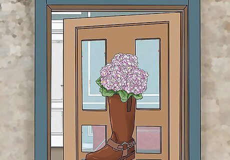 Make a door display with old boots. To complete this project, you will need a pair of old rain boots, a metal grommet, some burlap ribbon, and two cylindrical vases. Install a grommet into the back of each boot, using a hammer. Thread a piece of burlap ribbon through both grommets. Place a 3-inch-wide vase in each boot and fill the vases with flowers. If the vases seem unstable, pack the bottom of the boots with tissue paper. Tie the ends of the ribbon into a knot, then hang the display from a nail in your front door. Grommets can be purchased at any hardware store.