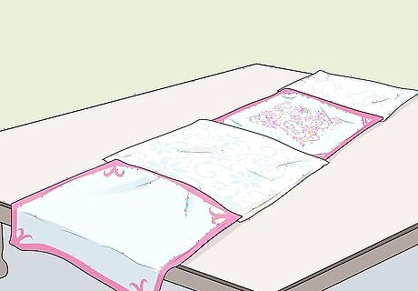 Make a table runner out of handkerchiefs. Start by measuring the length of the table you want to cover (add a couple of inches on each side so the runner has some overhang). For an 82-inch-long table, use ten 12-inch handkerchiefs. Place two handkerchiefs pattern side down and pin them together so the edges have 3/8” worth of overlap. Stitch the handkerchiefs together. Repeat this process until all the handkerchiefs have been attached to form one long runner.