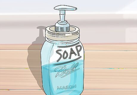 Transform a Mason jar into a soap dispenser. Start by measuring the center of the jar’s lid; mark the center of the jar with a pen. Take a ½” high-speed drill bit and drill a hole in the center of the jar lid (make sure the hole is big enough to fit a pump from a soap dispenser). Pour liquid soap into the jar, put the lid back on, and place the pump inside the hole. You can use scissors to trim the bottom of the pump if it’s too long for the jar. Soap dispenser pumps can be purchased online or recycled from old soap dispensers.