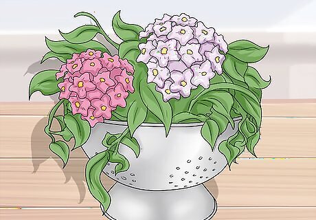 Create a planter out of a colander. Wrap twine around the handle of the colander, making sure to wrap the twine tightly to avoid gaps. Secure the twine by tying it and adding a little glue. Repeat the same process on the colander’s other handle. Place sheet moss inside the colander to line it. Fill the colander with potting soil, then plant ferns and pansies inside. Attach four lengths of twine to the colander handles, then use the twine to hang the colander in a sunny spot.
