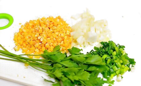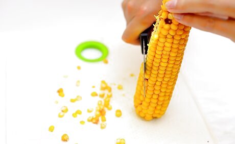 Shuck, clean, and cut the corn. Shuck two large ears of corn. Rub the kernels with a fresh terry cloth towel to remove the silks. Hold the clean cob vertically, placing one end on a cutting board. With a sharp knife, slice down the length of the cob to remove the kernels.