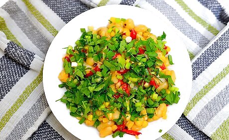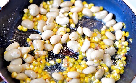 Sauté the vegetables. Pour 2 tablespoons vegetable oil into a large, nonstick skillet. Heat the oil over medium heat. Add ¼ cup red bell pepper, ¼ cup onion, and 2 cloves of minced garlic. Cook these ingredients for 2 minutes, stirring regularly. Add 1 ½ cups edamame, 2 cups corn, and 3 tablespoons white wine or vegetable stock. Cook for an additional 4 minutes, stirring frequently.