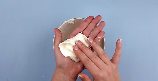 Knead the ingredients together for about 5 minutes. Fold the cornstarch over the shaving cream, then press down on it. Keep folding and pressing the ingredients until they start to clump together and form a dough. The dough may look crumbly at first, but eventually it will stick together and turn soft. This will take about 5 minutes.