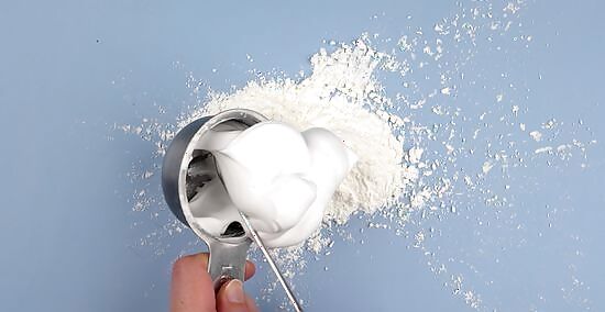 Add an equal amount of shaving cream. Again, the amount does not have to be precise. Simply squirt enough shaving cream onto the cornstarch until the amounts look equal. Make sure that you are using the creamy, foamy type of shaving cream. Don't use the gel kind. You don't have to use a measuring cup for this. It will be too messy and too much of a hassle.