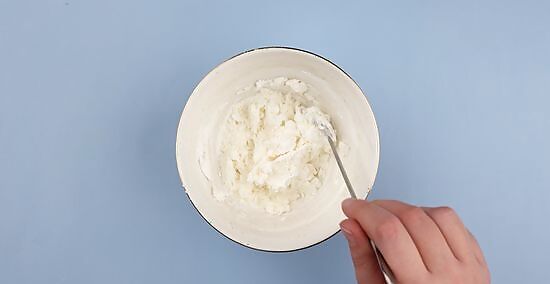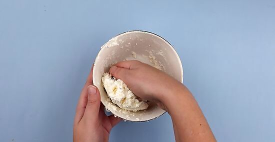 Mix everything together with a spoon or rubber spatula. Scrape the sides of the bowl often so that all of the cornstarch goes into the conditioner. If the play dough sticks to the spoon too much, add 1 teaspoon of cornstarch. If the play dough is too crumbly, add 1 teaspoon of conditioner.