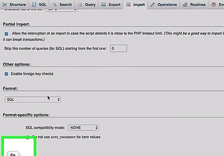 Import your database. You can do this by logging in to the cPanel account and launching the phpMyAdmin app. Select the new database you created for your WordPress account and click “Import.” Click “Choose File” and navigate to the SQL file created in the earlier export. Click to uncheck the box under the “Partial Import” header. Make sure SQL is selected under the “Format” header. Click “Go.” The import may take a few minutes to hours, depending on the amount of information in that file. You’ll get an email or server message when the import is complete.