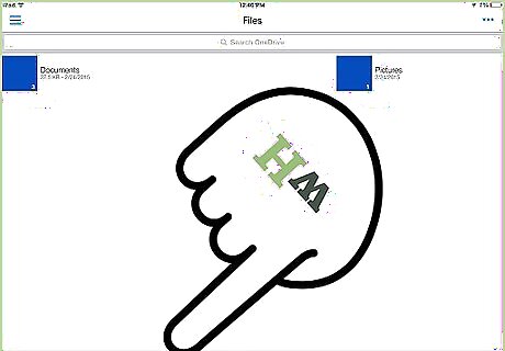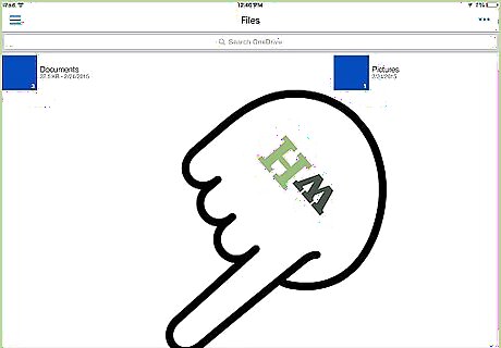 View files. On the bottom menu, tap on the cloud icon titled “Files.” This will bring up the file directory of your OneDrive account. You can view all the main folders and files from here.