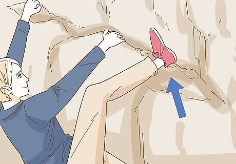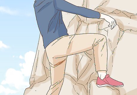 Utilize your legs and feet to take weight off of your arms. Essentially, use your legs and feet in tandem to pull and push the rest of your body as needed. Techniques like heel hooking and toe hooking can be very helpful. To heel hook, position your heel so that it’s caught against a bump or dip in the rock. Then, pull your heel toward your butt, engaging all the muscles in your leg. This will increase your body tension and take part of the weight off of your arms. To toe hook, perform these same steps, except with your toe on a lip or ridge instead of your heel. EXPERT TIP Erika Noble Erika Noble PCIA Certified Rock Climbing Instructor Erika Noble graduated from Stanford University with a BS in Management Science & Engineering. After competing in collegiate rock climbing competitions as part of the Stanford Rock Climbing team, Erika worked as a Rock Climbing Instructor in Lake Tahoe. She continues to boulder and climb throughout California and the Southwest. Erika Noble Erika Noble PCIA Certified Rock Climbing Instructor "If you can’t figure out the crux of a climb, consider using a heel or toe hook!" Erika Noble, rock climbing instructor, tells us: "It might not be obvious at first, but in some cases a heel hook can free up your hands and give you a better reach to complete a difficult series of moves."