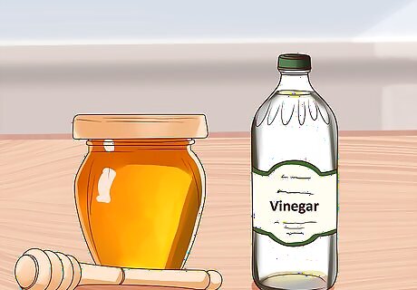 Use honey and vinegar. Honey and vinegar can also work together to lighten hair naturally. A simple recipe using honey and vinegar can be used on your hair if you want to lighten its natural shade. Use raw, unpasteurized honey, which you can find at most health food stores. Use a cup of raw honey, two cups of distilled vinegar, a tablespoon of extra virgin olive oil, and a tablespoon of ground cardamon or cinnamon. Mix the ingredients together into a paste. Run your hair under the shower to get it damp. Divide your hair into sections. Apply the paste to each section from roots to tips. Wrap your hair using plastic wrap and keep the wrap secure using a shower cap or swim cap. Leave the mixture in overnight. Then, wash it out in the morning.