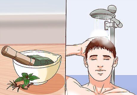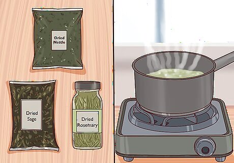 Blend grey hairs with sage. Add to a small pot one tablespoon (15 grams) each of fresh or dried rosemary, nettle, and sage. Add two cups (16 ounces) of water and bring to a boil over medium heat. When it’s boiling, continue simmering for 30 minutes, and then remove it from the heat to cool. When the mixture has boiled and cooled to room temperature, strain out the herbs and transfer the infused water to a spray bottle. Spray the herb water on your hair after every shower, comb it through your hair, and style as usual. The sage will help cover greys, the rosemary will give your hair a nice shine, and the nettles are a great restorative.
